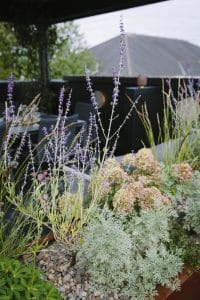 Flowering perennials were planted in the planters to give splashes of seasonal colour as well as being good pollinators. These included Perovskia; Sedum matrona; Erigeron karavitense; Verbena bonariensis; Rudbeckia Goldsturm; Actaea; Persicaria; Artemesia “Powis Castle”.